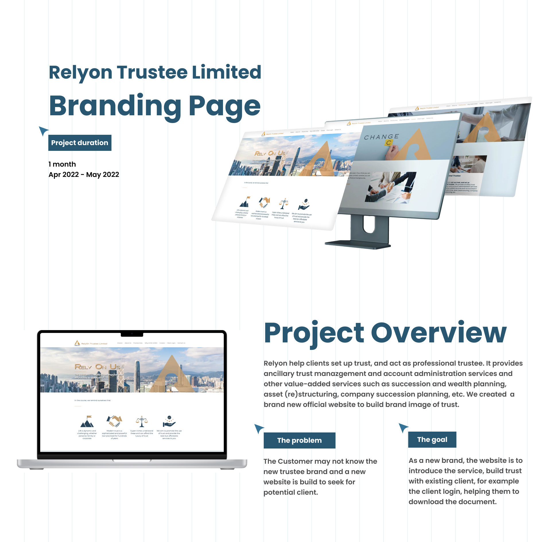 Relyon help clients set up trust, and act as professional trustee. It provides ancillary trust manazgement and account administration services and other value-added services such as succession and wealth planning, asset (re)structuring, company succession planning, etc. We created a brand new official website to build brand image of trust.